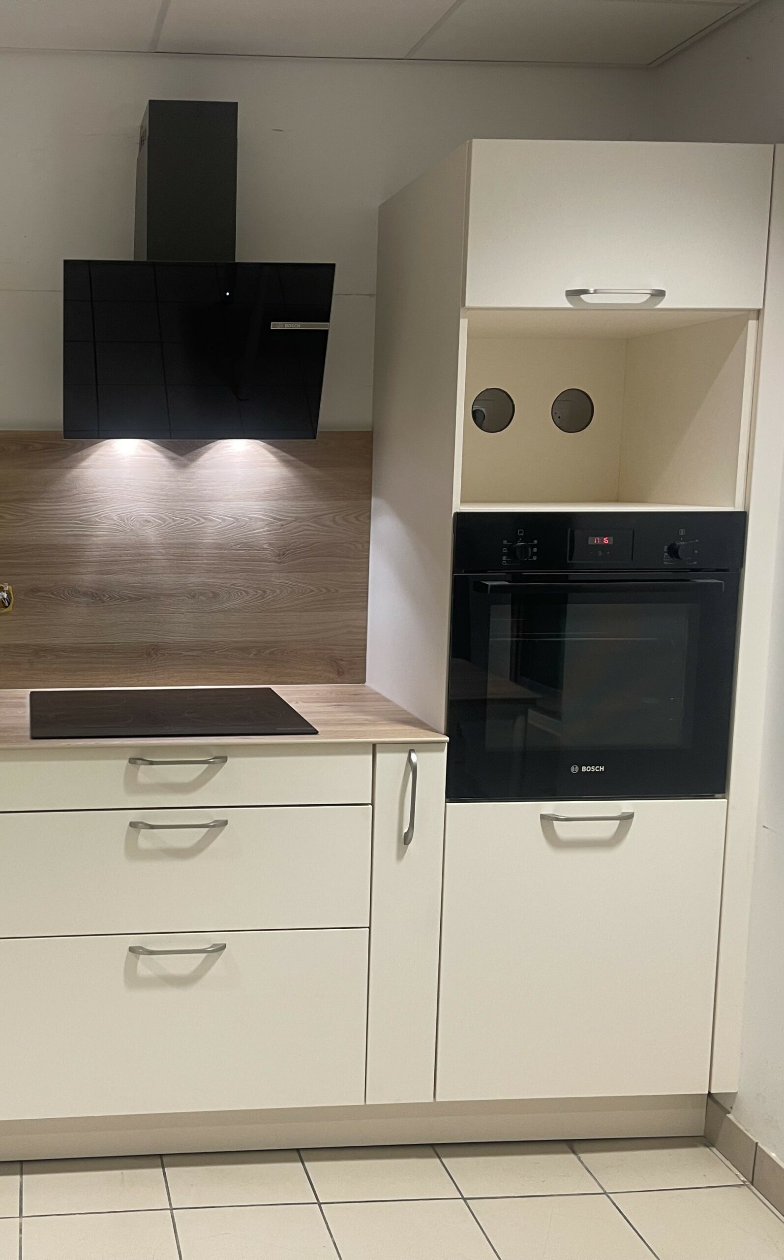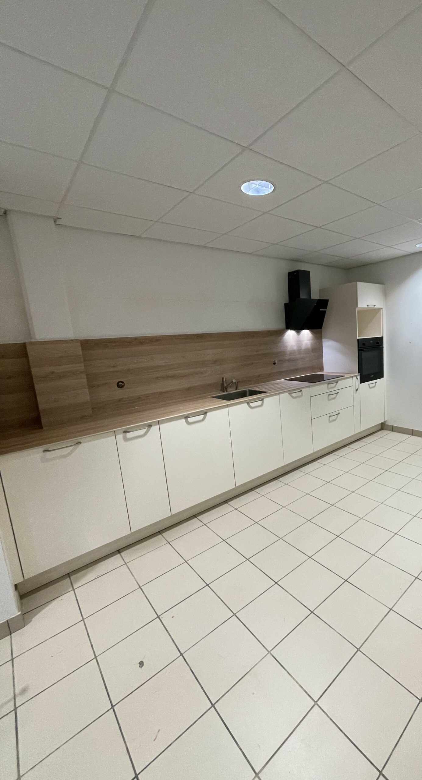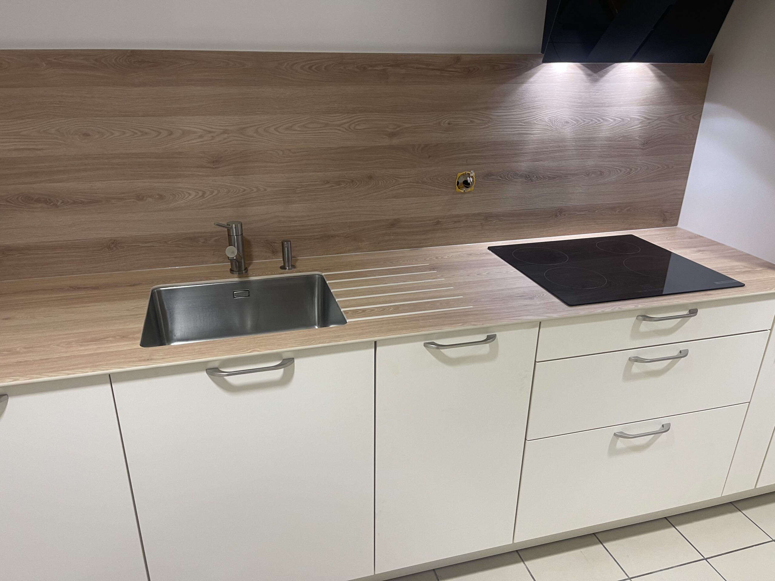 Cuisine meubles en laque coloris magnolia, plan de travail en compact et crédences bois clair