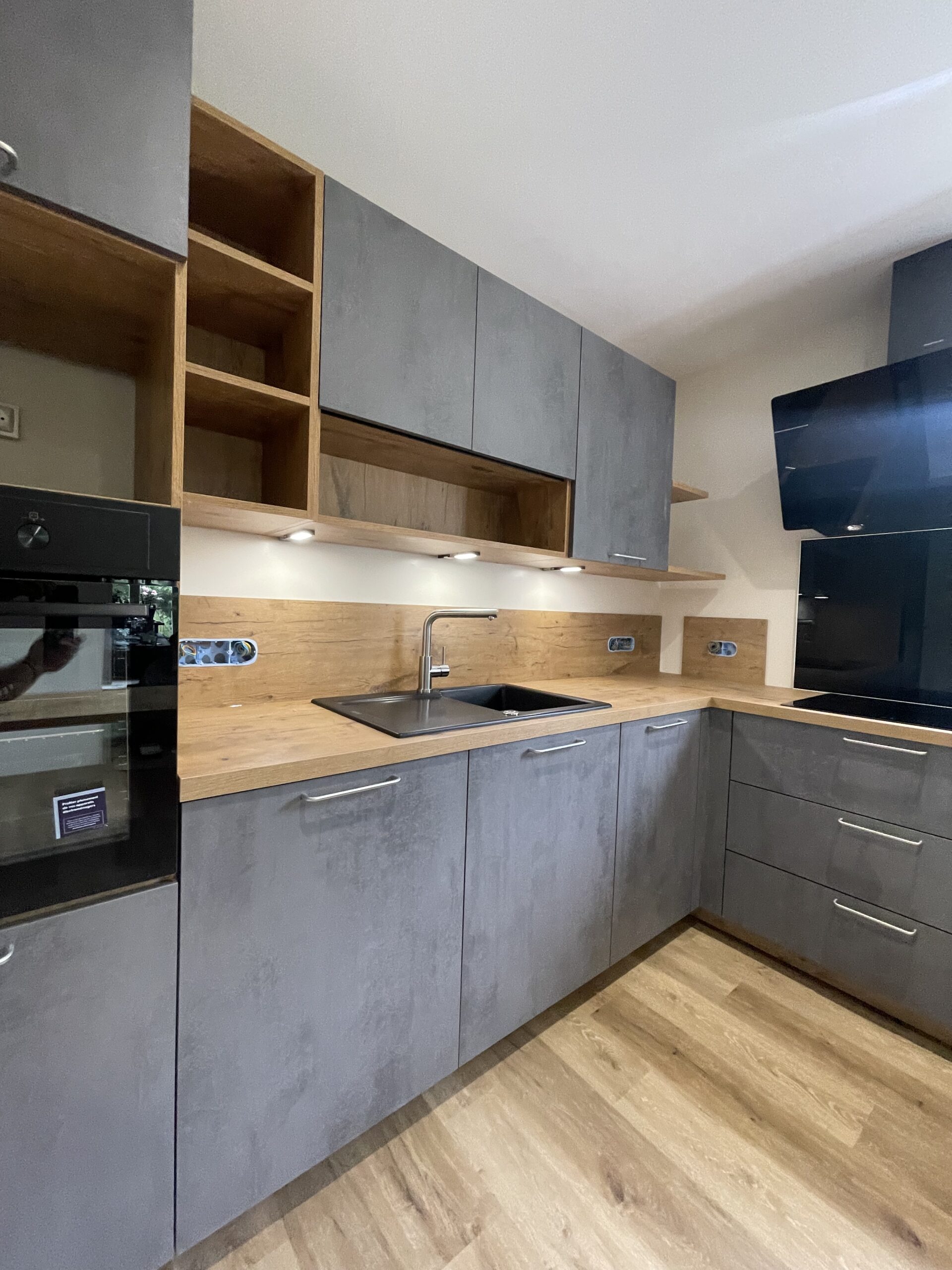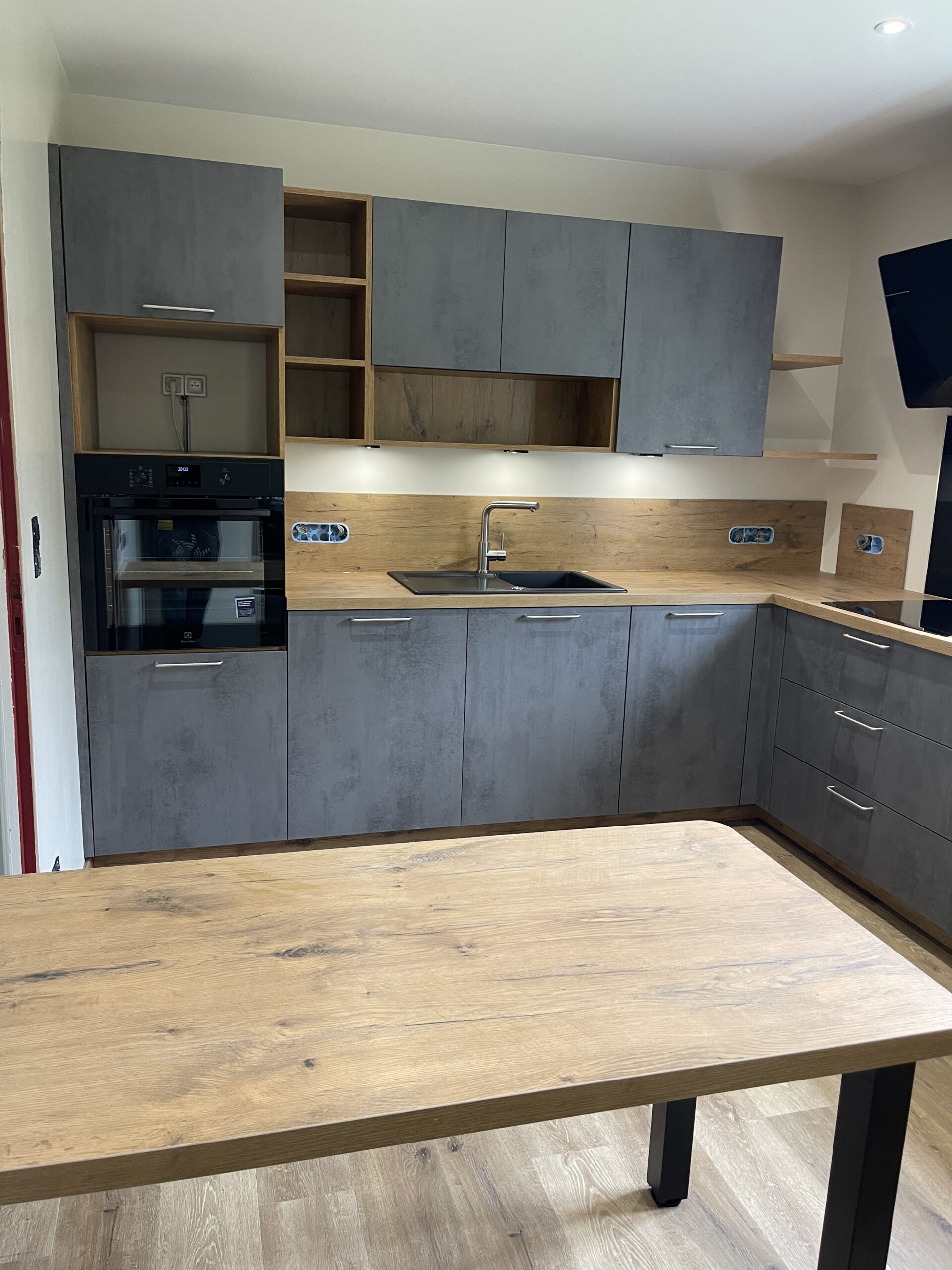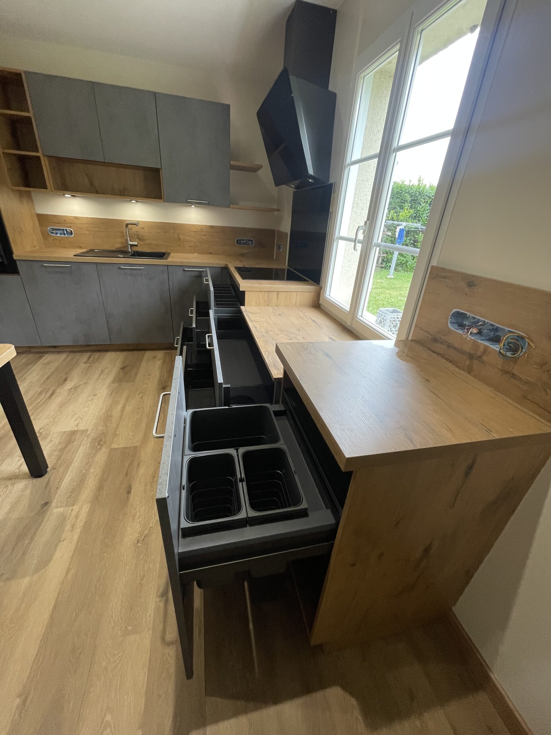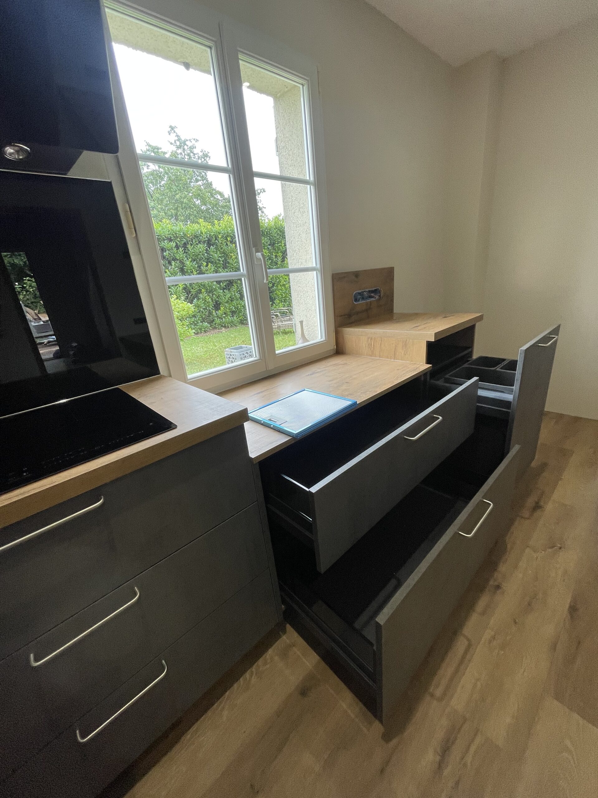 Étiquettes:cuisine Cuisine grise et bois clairnombreux tiroirs casseroliers,meuble colonne pour fours chaleur tournante et micro-onde,meuble haut éclairé par Led,coin repas sur mesure, nombreux tiroirs casseroliers hotte aspirante, tiroirs casseroliers meuble colonne four, meubles haut éclairés vue d’ensemble cuisine grise et bois clair table repas sur-mesure bois clair aménagements tiroirs Prenez rendez-vous au plus vite