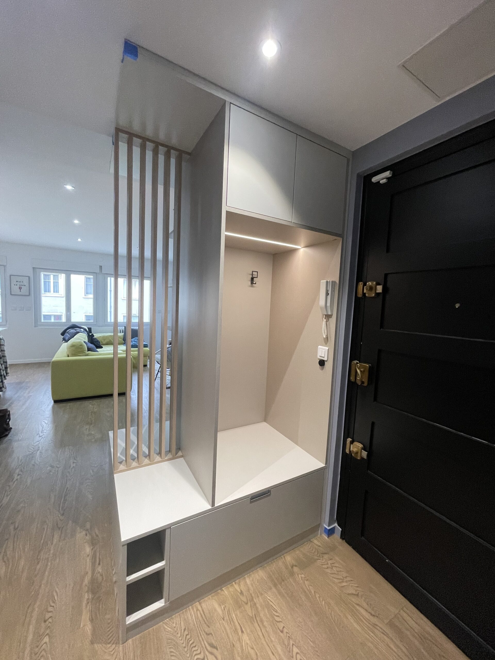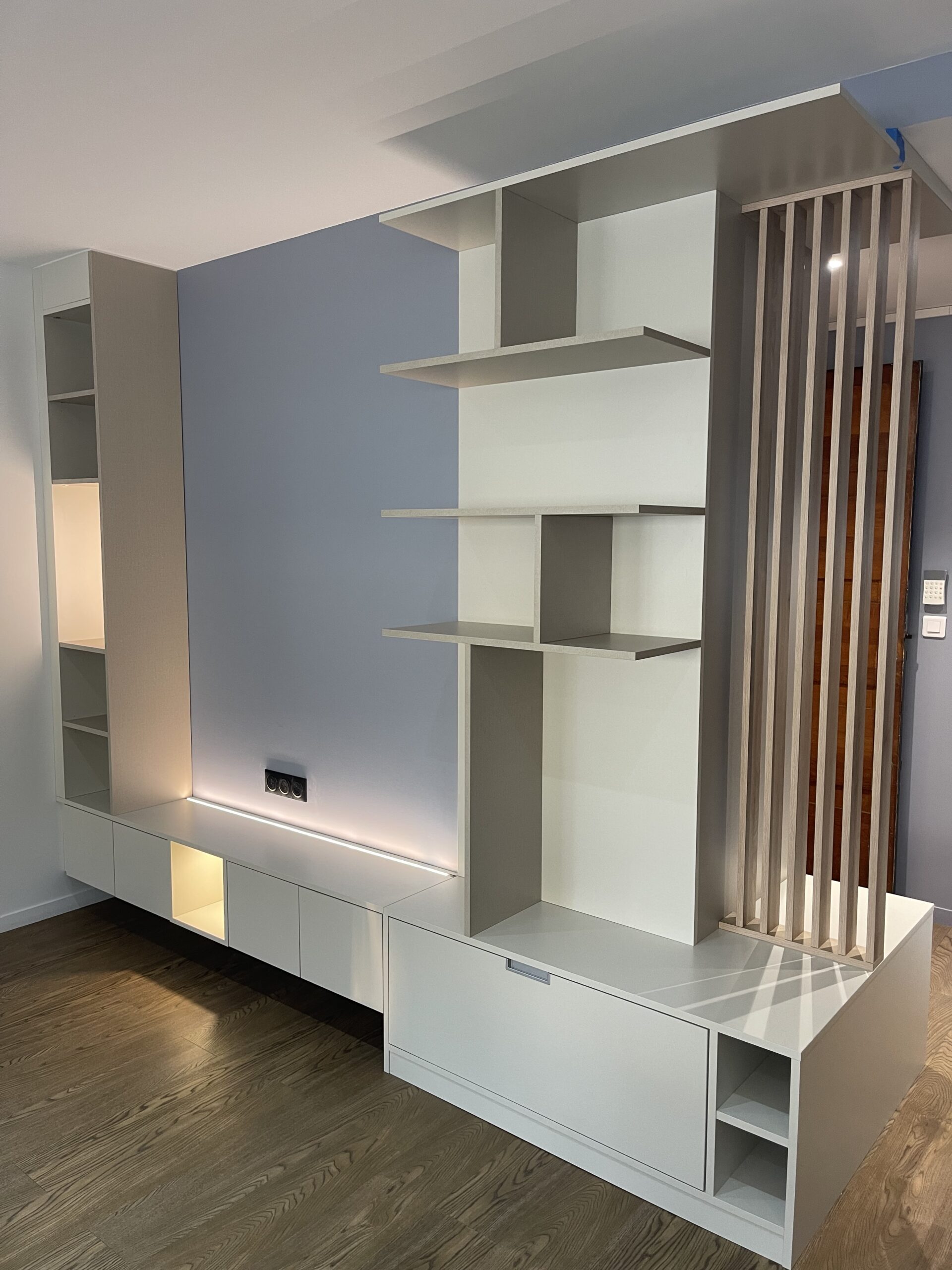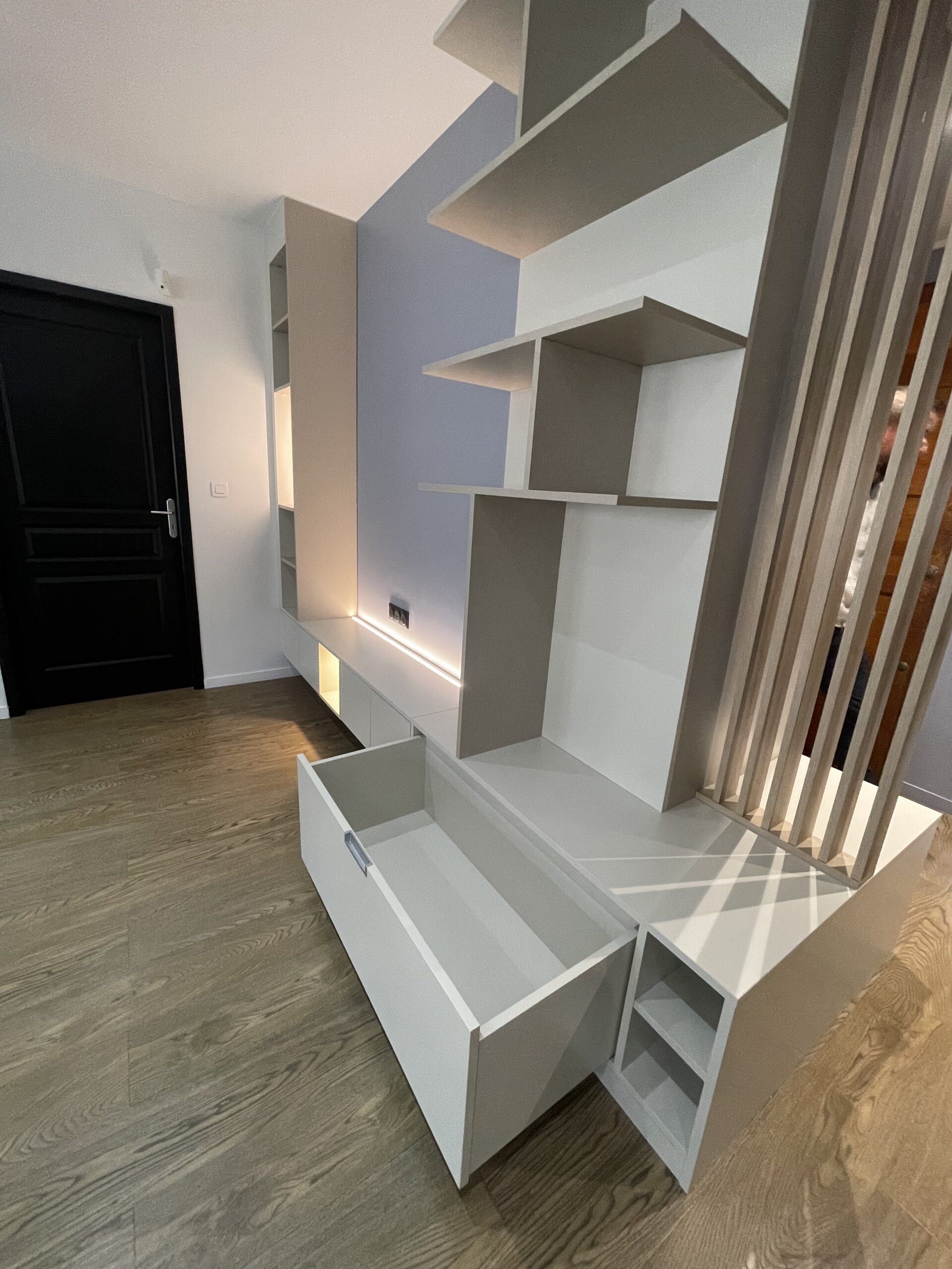 Étiquettes:cuisine Dressing d’entrée séparant le salon :coté entrée :vestiaire pour porte manteaux,tiroirs range chaussures, Pare-vue,assise,coté salon :niches,tiroirs de rangement,meuble TV pare-vueGrand choix de matières, de finitions et d’aménagements Prenez rendez-vous au plus vite